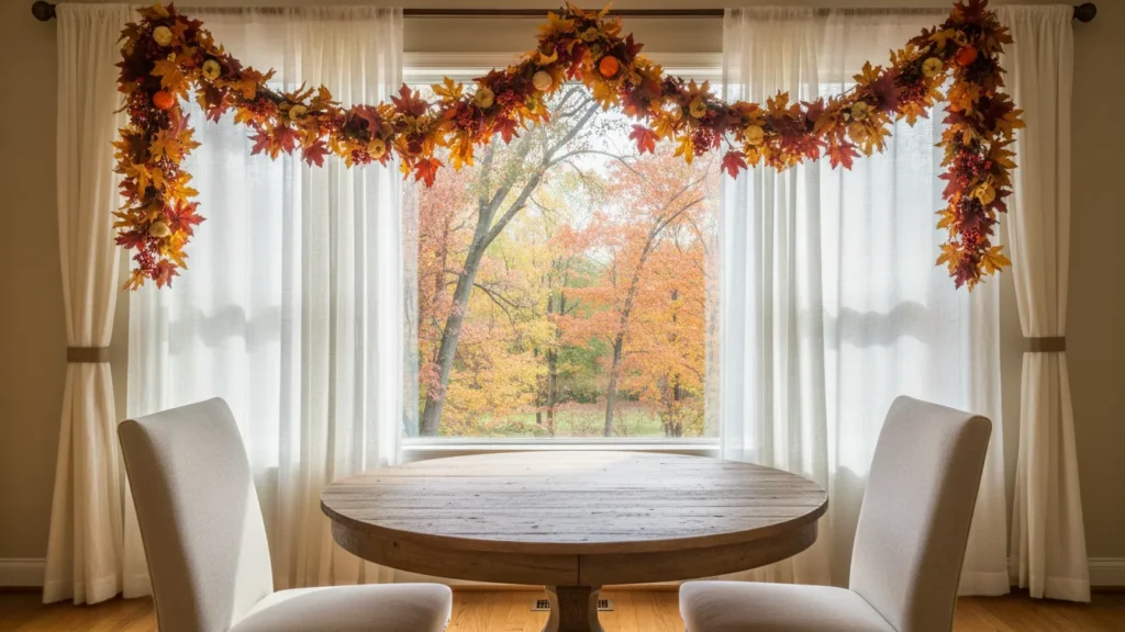 If your dining room has windows, consider adding fall-colored curtains or a simple garland along the curtain rod.