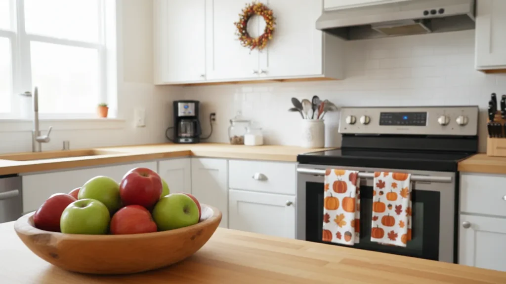 Small touches make a difference: a bowl of fresh apples on the counter, a fall wreath on a cabinet door, or kitchen towels in harvest patterns. I also love displaying pretty serving pieces I’ll use for dinner—it’s both decorative and functional.