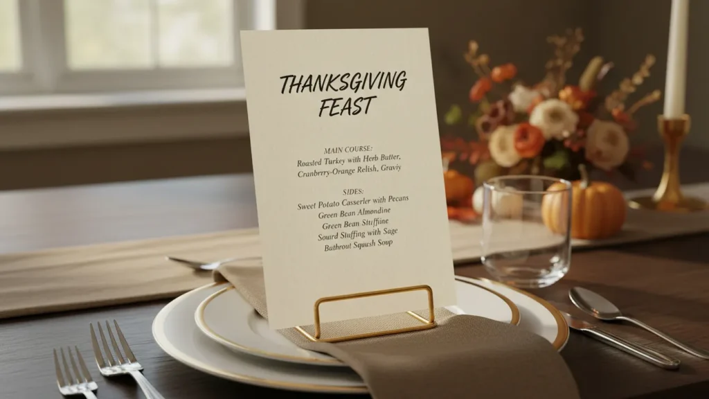 A simple menu card at each place setting or displayed on a small easel makes your dinner feel special. It doesn’t have to list every item, just the highlights: