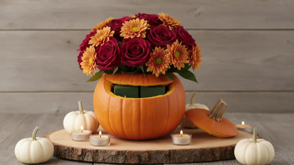 Hollow out small to medium pumpkins and use them as vases for fresh flowers. Mums, sunflowers, and roses all work beautifully. This is one of my favorite DIY projects because it looks expensive but costs very little.