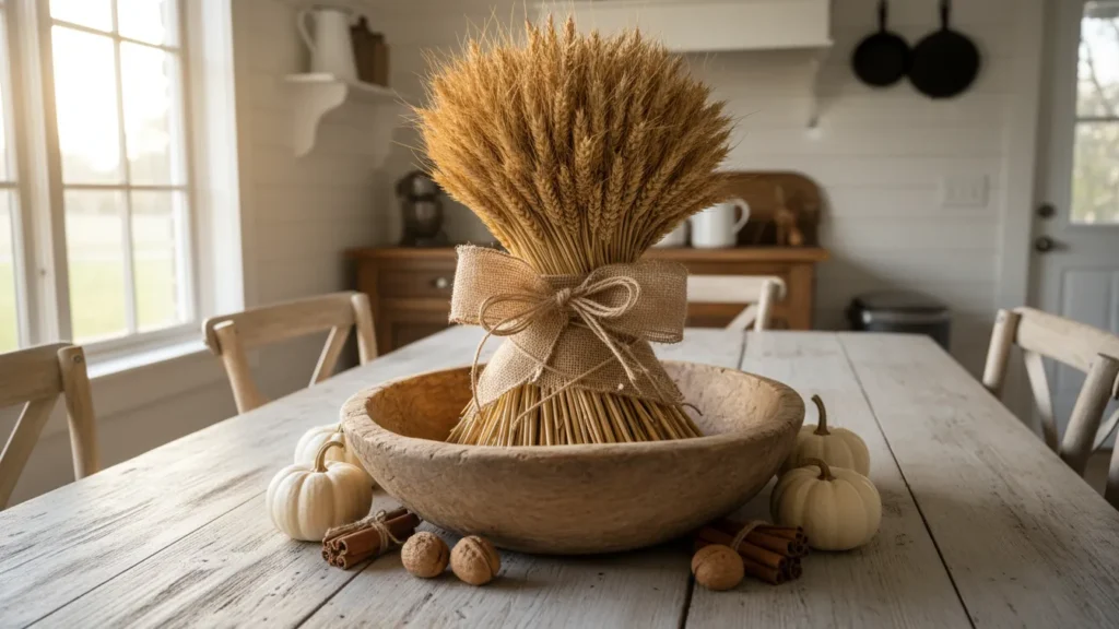 Gather dried wheat stalks and tie them with burlap ribbon. Place them in a wooden tray or dough bowl with small white pumpkins scattered around the base.