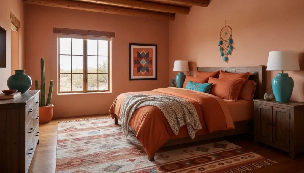The Southwestern color scheme pulls directly from desert landscapes. Think terracotta, sage green, dusty pink, deep turquoise, and warm sunset oranges. These colors feel vibrant without being overwhelming.