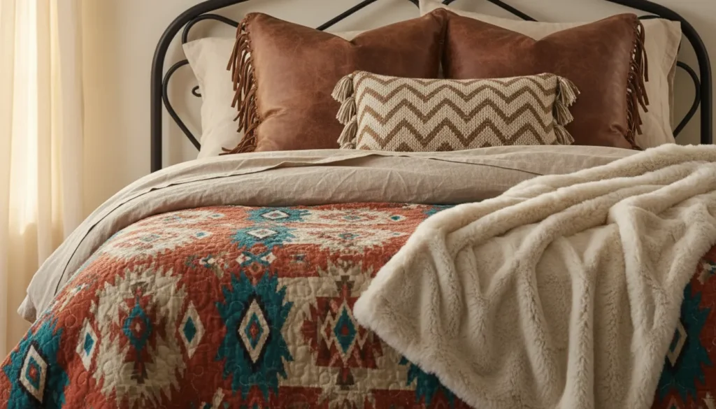 But here’s something people often miss – you don’t need patterns everywhere. A solid-colored linen duvet in cream or tan provides a neutral base that lets other western elements shine. Layer it with a patterned throw blanket at the foot of the bed for visual interest.