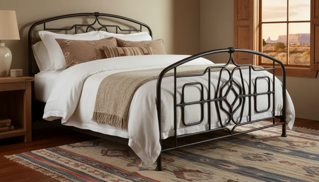 Wrought iron beds offer another excellent option. The dark metal paired with simple, geometric designs fits perfectly with western aesthetics. Plus, they’re typically lighter and easier to move than their wooden counterparts.